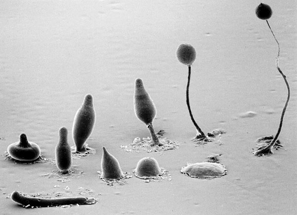 What happens after the slug stage is when things really get weird. Once the slug is in a good place, it’ll stop and grow a “fruiting body,” or sorus, which will release loads of spores that baby slimes will hatch out of. This sorus is perched upon a long stalk made of dead cells.... dead cells!! This is the point at which the nature of this… thing… really gets called into question, at least for me. If these were a bunch of individuals, why in the world would they self-sacrifice, completely giving up their chance at reproduction, so that a bunch of randoms can do it instead?! Sure, altruism is observed in countless species from branches all across the tree of life, but to this extent? Literally built in to the life cycle? For a multi-cellular organism, killing some cells for the benefit of others is perfectly normal, but for single-celled life..? That's a very very stupid thing to do! Therefore, can we really call these guys individuals anymore?